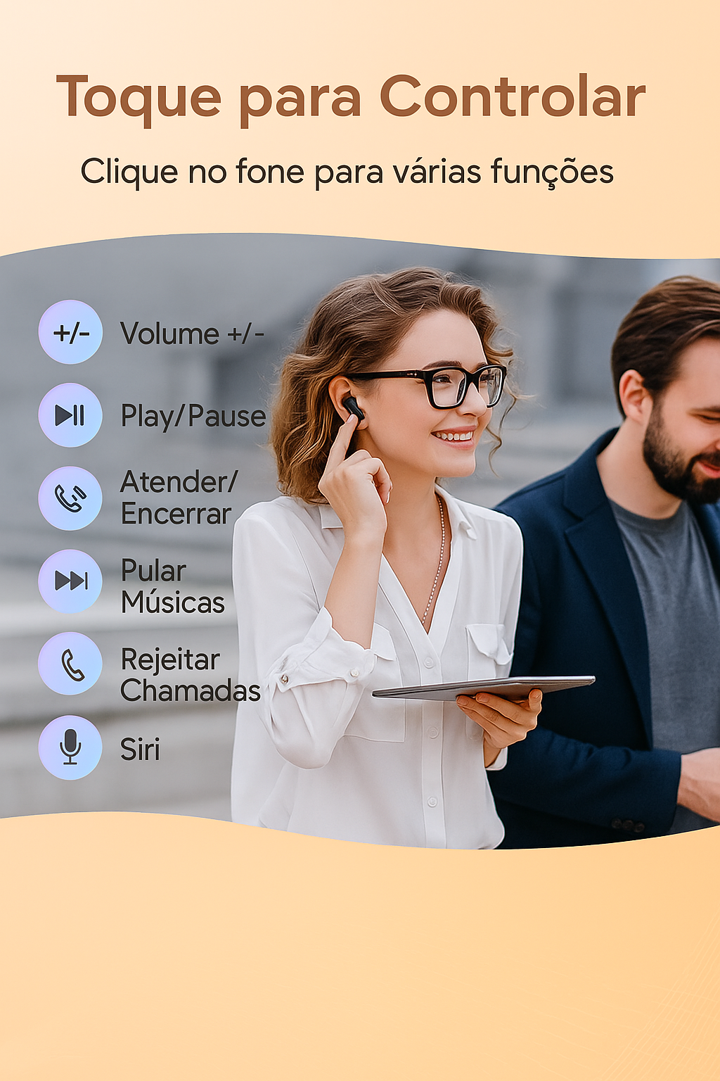 • 🖐️ Controle Touch Inteligente — mude faixas, atenda chamadas e ajuste o volume com apenas um toque, sem tirar o celular do bolso.